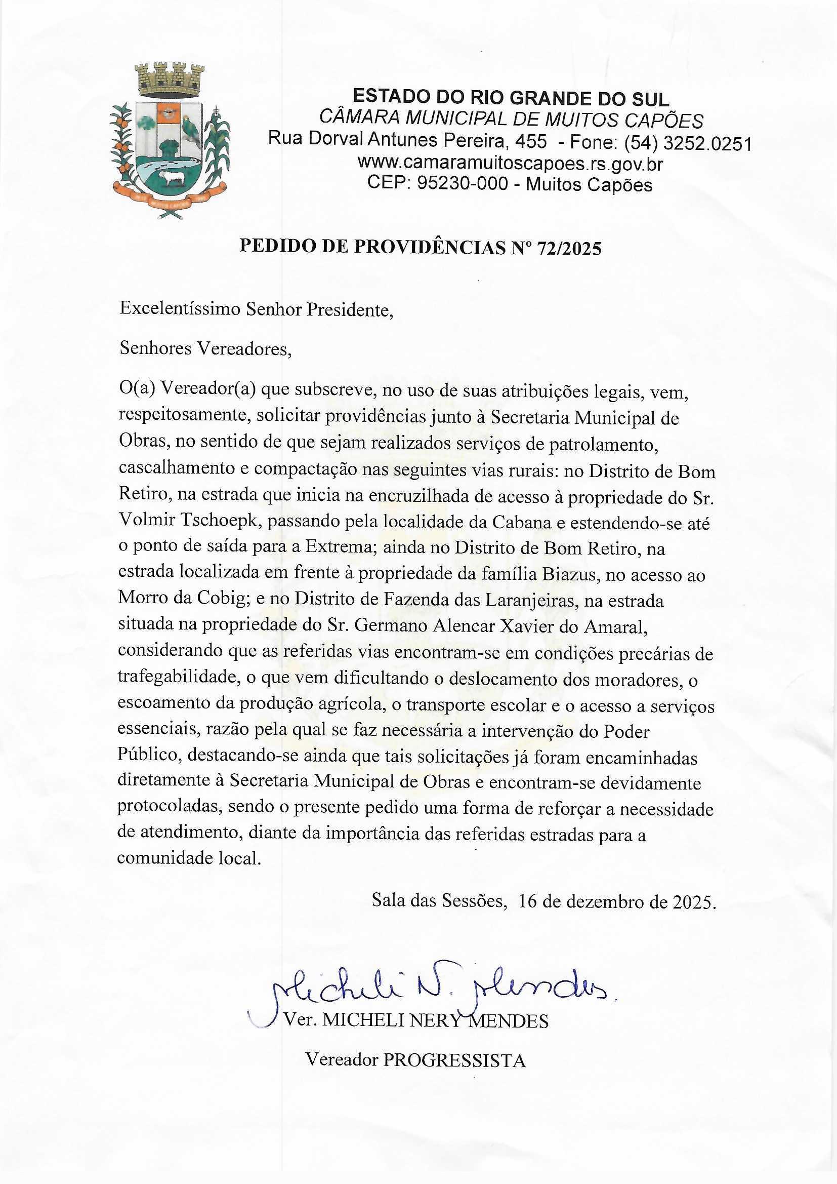 Solicitação: PEDIDO DE PROVIDENCIA N° 72/2025 Conteúdo: