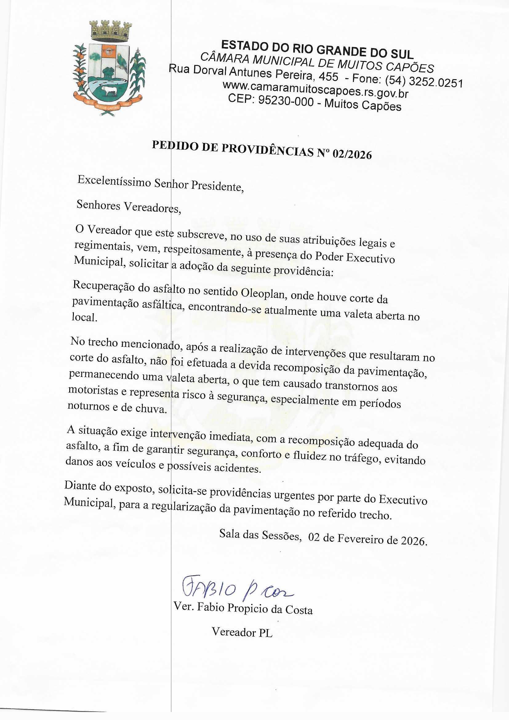 Solicitação: PEDIDO DE PROVIDENCIA N° 02/2026 Conteúdo: