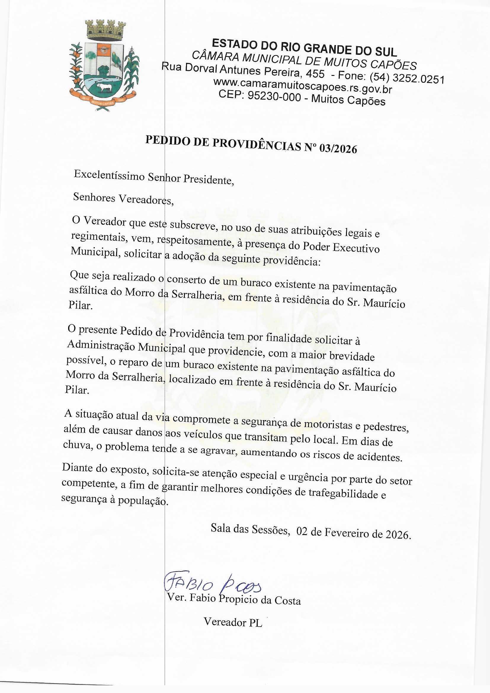 Solicitação: PEDIDO DE PROVIDENCIA N° 03/2026 Conteúdo: